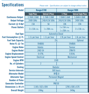 7kVA 5.6kW – 240/415V 50Hz Three Phase or optional Single Phase.