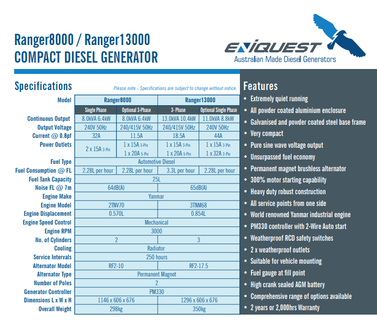Eniquest Ranger8000 and 13000 diesel generators are manufactured in Queensland using locally sourced components. It is the quietest, most fuel efficient and robust diesel generator available and has been developed specifically for reliable commercial and domestic power and solar backup. With a focus on ease of maintenance, the modular construction offers complete access to all components and this is backed up by a complete stock of spares if ever required